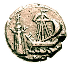 - Kupfer-Drachme (Æ), Avers Kaiser Hadrian mit Lorbeer und Panzer, 18. Regierungsjahr 133; Revers Leuchtturm, Isis Pharia mit Segel
