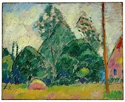 Eine erste Orientierung Jawlenskys in Richtung der Pariser Avantgarde markiert das Jahr 1902, als er begann, Stillleben und Landschaften im neoimpressionistischen Stil zu gestalten.[21] 1903 reiste Jawlensky nach Paris. Sein Bild Das Waldhäuschen aus diesem Jahr bestätigt seine Auseinandersetzung mit der Kunst van Goghs, die ihn in den Jahren 1904 bis 1906 beschäftigte.
