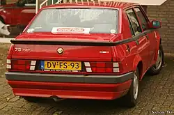 Von 1986 bis 1990 war der 1,8 Liter große Vierzylinder auch mit Turboaufladung erhältlich. Die Aufladung ermöglichte eine Leistungssteigerung ohne Vergrößerung des Hubraums, sodass sich die in Italien übliche hohe Besteuerung für Autos mit mehr als 2 Litern Hubraum vermeiden ließ.[3] Die Modellbezeichnung lautete bei Markteinführung Alfa 75 1.8 I.E. Turbo. Diese frühe Version ist äußerlich mit dem regulären 1.8 identisch, hat allerdings in Wagenfarbe lackierte (europäische) Stoßfänger. Ab 1987 wurde das Auto dann als Alfa 75 Turbo America verkauft; in dieser Form trägt es die größeren Stoßfänger nach amerikanischer Norm.[14] Mit ihnen stellte Alfa Romeo eine Nähe zu den leistungsstarken Sechszylindermodellen her, die entsprechend ausgestattet waren. Der 1.8 I.E. Turbo war ausschließlich mit einer Jetronic-Benzineinspritzung von Bosch lieferbar; eine Vergaserversion gab es nicht. Der Turbolader kommt von Garrett (Typ T3). Serienmäßig kommt ein Ladeluftkühler zum Einsatz. Der Ladedruck liegt bei maximal 0,75 bar. Die Motorleistung der ersten vier Baujahre beträgt 114 kW (155 PS); im letzten Produktionsjahr stieg sie auf 121 kW (165 PS) an.[15][16] Das Auto war nicht mit einem Katalysator erhältlich, sodass es nicht auf allen Märkten angeboten werden konnte.