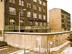 Bis zum Jahr 2000 war auf der linken Brandmauer eine auffällige Werbung für die Zeitung Neue Zeit angebracht