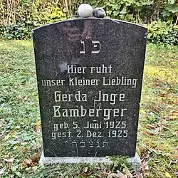 - ↑ Gerda Inge Bamberger verstarb als Kleinkind im Alter von knapp 6 Monaten und wurde in der Kinderabteilung des Jüdischen Friedhofs auf dem Glockenberg in Coburg beigesetzt. Der in jüngerer Zeit neu gesetzte Grabstein trägt die Inschrift: „Hier ruht unser kleiner Liebling Gerda Inge Bamberger geb. 5. Juni 1925 gest. 2. Dez. 1925“.