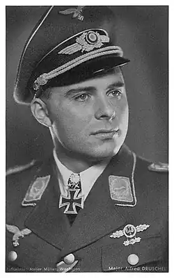 Im Jahre 1936 trat Alfred Druschel der Luftwaffe bei und wurde als Leutnant 1938 Beobachter im Kampfgeschwader. Für kurze Zeit diente er im Stab als Ordonnanzoffizier. Danach ließ er sich zu der ersten Schlachtfliegergruppe der Luftwaffe der II.(Schlacht)/LG 2[1] versetzen. Er erlebte zahlreiche Einsätze in Polen mit und flog einige Einsätze gegen französische Panzerkräfte bei Cambrai. Nachdem die Schlacht um Frankreich entschieden war, kämpfte er mit der Henschel Hs 123 bei der Luftschlacht in England, auf dem Balkan und in der Sowjetunion mit. Seine Einsätze führte er sowohl als Einzelkämpfer als auch als Staffelkapitän durch.