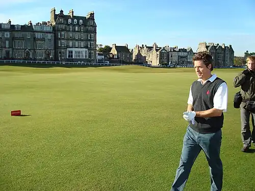 | Text zum Bild: | Hugh Grant auf dem Old Course in St Andrews bei den Alfred Dunhill Links Championship 2007. |
