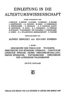 - Geschichte der Philosophie. In: Alfred Gercke, Eduard Norden (Herausgeber): Einleitung in die Altertumswissenschaft. Band 2, Leipzig/Berlin 1910, S. 291–389. 2. Auflage, Leipzig/Berlin 1912, S. 275–382. 3. Auflage, Leipzig 1922, S. 358–477 (= Einleitung in die Altertumswissenschaft 2,6). 4. Auflage, bearbeitet von Ernst Hoffmann, Leipzig/Berlin 1932.