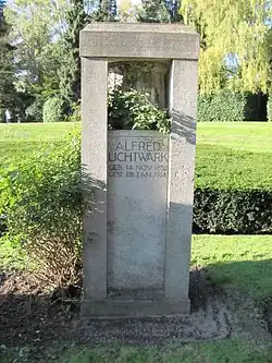 Wegweisend sind seine Übungen in der Betrachtung von Kunstwerken, bei denen er mit Schülern Kunstwerke in seinem Museum systematisch besprach. Die Erkenntnisse daraus verbreitete er in Vorträgen und mehreren Büchern. Er gilt damit als einer der Begründer der Museumspädagogik.[3] Alfred Lichtwark blieb Direktor der Kunsthalle bis zu seinem Tod 1914. Er starb an den Folgen einer Magenkrebserkrankung. Auf der Trauerfeier im (Alten) Krematorium an der Alsterdorfer Straße hielt Max Liebermann die Trauerrede.[4] Zwei Monate später gab es in der Musikhalle eine offizielle Gedächtnisfeier, auf der Bürgermeister Max Predöhl Lichtwark würdigte. Die Asche wurde auf dem „Althamburgischer Gedächtnisfriedhof“ genannten Teil des Friedhof Ohlsdorf in Hamburg beigesetzt (Grab 24).[5] Der Grabstein wurde von Fritz Schumacher entworfen, der viele Jahre später direkt neben Lichtwark bestattet wurde. Der Nachfolger Lichtwarks an der Kunsthalle wurde Gustav Pauli.