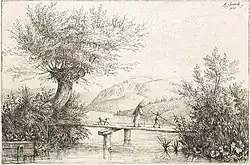 Flusslandschaft mit Brücke, Radierung von Alfred von Franck (1871)