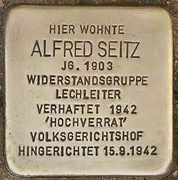 Alfred Seitz (* 10. Februar 1903 in Mannheim; † 15. September 1942 in Stuttgart) arbeitete seit 1939 als Pfleger im Krankenhaus Rohrbach, der heutigen Thoraxklinik in Heidelberg. Er war wie seine Ehefrau Käthe Mitglied der Widerstandsorganisation „Lechleiter-Gruppe“, die an der von der KPD herausgegebenen Zeitung Der Vorbote – Informations- und Kampforgan gegen den Hitlerfaschismus mitwirkte. Er wurde, wie 13 weitere Mitglieder, wegen „Vorbereitung zum Hochverrat“ angeklagt und am Morgen des 15. September 1942 durch das Fallbeil hingerichtet.[1]