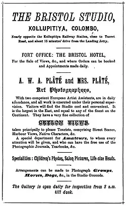 Im Jahr 1887 arbeitete A. W. A. Plate in der fotografischen Abteilung der Colombo Apothecaries Company in Colombo,[1] ein 1883 von W. M. Smith und James Smith Finlay gegründetes Handelsunternehmen, das zunächst mit Öl und Spirituosen handelte, sich dann aber auch mit der Vervielfältigung und dem Verkauf von Fotografien befasste.[5] und seit 1892 unter dem Namen Colombo Apothecaries Company firmierte.[6] Im Jahr 1890 verließ A. W. A. Plate die Colombo Apothecaries Co.