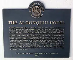 1987 wurde das Algonquin Hotel in die Liste der National Historic Landmarks in New York City aufgenommen[8] und 1996 wurde es zum Nationalen Literarischen Denkmal ernannt.