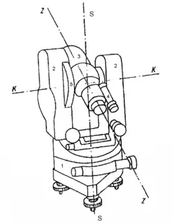 Am Theodolit (Bild unten) wird der gesamte drehbare Mittelteil Alhidade genannt. Er trägt die zwei Stützen für das Fernrohr, die Ableseoptik für den darunter liegenden Horizontalkreis, in der linken Stütze den Höhenkreis, die Klemmen und Feinbewegungen beider Kreise und die Alhidadenllibelle zur Horizontierung des Instruments. Der Unterbau mit den drei Fußschrauben, auf dem sich die Alhidade dreht, beinhaltet die Stehachse, den Horizontalkreis, dessen Verstelltrieb und den zugehörigen Beleuchtungsspiegel.