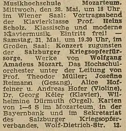 - ↑ (Anzeige Musikhochschule Mozarteum). In: Salzburger Nachrichten. Herausgegeben von den amerikanischen Streitkräften für die österreichische Bevölkerung / Salzburger Nachrichten. Unabhängige demokratische Tageszeitung, 27. Mai 1947, S. 4 (online bei ANNO).