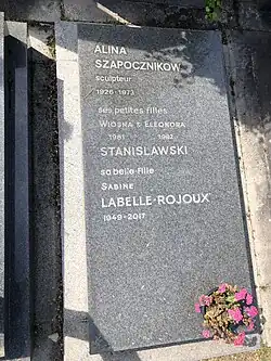 Alina Szapocznikows Grab befindet sich auf dem Friedhof Montparnasse, division 9, 7ième ligne sud, 11 est in Paris.