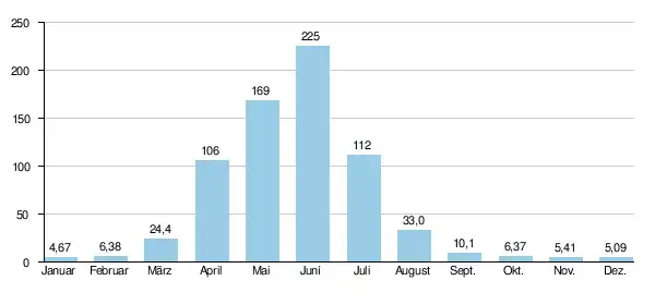 Mittlerer monatlicher Abfluss des Alingar (in m³/s) am Pegel Pule Qarghai