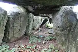Das Südost-Nordwest orientierte Galeriegrab aus Dolerit ist eines der ersten Denkmäler, die durch den französischen Staat geschützt wurden. Die etwa 16,0 m lange Megalithanlage besteht aus 28 Tragsteinen (14 in situ) und acht Deckenplatten. Sie wurde 1854 von Jules Henri Geslin de Bourgogne (1812–1877) ausgegraben. Gefunden wurden eine Urne mit Knochen, Äxte, Perlen, Werkzeuge aus Feuerstein und verschiedene Bronzen. Gallo-römische Überreste zeigen, dass das Denkmal wiederverwendet wurde.