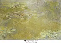 Als eine wichtige Inspirationsquelle dienen den modernen Künstlerinnen und Künstlern unter anderem die Seerosenbilder von Claude Monet, bei denen dieser die Wasseroberfläche mit Seerosen und Spiegelungen verschwommen darstellt.[1] Als Vorläufer des All-over-Paintings lässt sich der All over Style sehen. Dies ist ein Bucheinbandstil, den Samuel Mearne (16241683) im 17. Jahrhundert entwickelt hat. Dabei bedecken Stempelabdrucke die Buchdeckelfläche in symmetrisch freier Anordnung bis zum Rand ohne Umrahmung.[2]