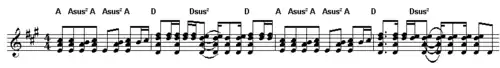 Hörbeispiel: Herunterladen, Informationen, Volles Notenbeispiel) Varianten von A-Dur- und D-Dur-Akkorden mit The Edge’s Delay Effekt, die den Refrain von All I Want Is You abschließen.Darüber hinaus ist auch Bonos Gesang mit einem Delay-Effekt versehen, der bei 125 ms liegt.