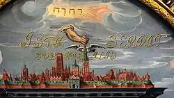 Über dem Triumphbogen erhebt sich die Silhouette der Stadt Danzig, mit Kirchtürmen, markanten Gebäuden und Mauern. Ein kräftiger Arm, der aus einer Wolke kommt, ergreift die Turmspitze des Rechtstädtischen Rathauses. Darüber zeichnet sich das Tetragrammaton ab, der Gottesname in hebräischen Buchstaben. Der Triumphbogen selbst trägt mehrere lateinische Inschriften.[9][10]
