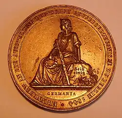 Am 15. August 1844 eröffnete im Berliner Zeughaus der preußische Finanzminister Eduard von Flottwell[2] im Beisein der übrigen Minister die von allen Staaten des Deutschen Zollvereins beschickte gut zweimonatige Gewerbeausstellung.[3] Die Berliner Gewerbeausstellung war eine Leistungsschau der deutschen Wirtschaft mit den Waren von 3040 Handwerkern und Fabrikanten. Landwirtschaftliche Geräte, Textilwaren, Möbel, Porzellan, Chemie, Medizintechnik, Klingen und Messer aus Solinger Stahl, Hinterladergewehre mit gezogenem Lauf aus Suhl und vieles mehr zeigten den Weg hin zur Serienherstellung von Waren in Fabriken statt der teueren Fertigung in Handwerksbetrieben und Manufakturen an, und auch der Fortschritt in der Technologie wurde offensichtlich.