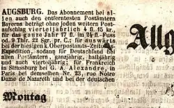 Vom 16. Januar 1807 bis 30. September 1882 erschien die Allgemeine Zeitung schließlich in Augsburg, mit vier Druckseiten täglich und einer umfangreicheren „Außerordentlichen Beilage“, die etwa wöchentlich erschien. Die Zeitung stützte sich anfangs stark auf andere Zeitungen wie die Frankfurter Zeitung, benannte diese häufig als aktuelle Informationsquelle und zitierte sie über mehrere Spalten hinweg wörtlich.[2] Die Außerordentliche Beilage berichtete losgelöst von der direkten Aktualität von politischen und juristischen, selten von religiösen oder kulturellen Grundthemen der Zeit und druckte unkommentiert Gerichtsurteile und Gesetzestexte, vor allem aus Bayern, ab. In den ersten Jahren enthielt die Zeitung keine Werbung und Kleinanzeigen.