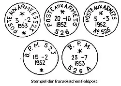 Die französische Militärpost informierte, über die Deutsche Bundespost am 29. September 1953, dass die Anschrift für Postpakete an Angehörige der französischen Streitkräfte, deren Postsendungen über Militärpostämter geleitet werden, nur folgende Angaben enthalten durfte: 1. Name, Vorname, Dienstgrad (Stammrollennummer bei den Angehörigen der Streitkräfte, die aus Nordafrika oder den Überseegebieten stammen), 2. ggf. Kompanie, Batterie oder Eskadron und 3. die Nummer des Postbezirks (mit 5 Ziffern). Die Nummer des Militärpostamts (mit 3 Ziffern) durfte nicht angegeben werden.