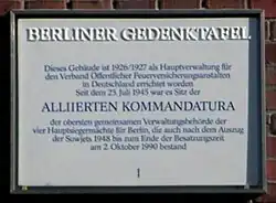 Nachdem britische und US-amerikanische Truppen in die von der Roten Armee eroberte deutsche Reichshauptstadt eingerückt waren,[2] trat die Alliierte Kommandantur für Berlin zum ersten Mal am 11. Juli 1945 in den Räumen der sowjetischen Zentralkommandantur zusammen.[3] Ab 25. Juli 1945 zog die Kommandantur in den amerikanischen Sektor nach Berlin-Dahlem in die Kaiserswerther Straße 16/18. In dem von Heinrich Straumer errichteten ehemaligen Hauptsitz des Verbandes der öffentlichen Feuerversicherungsanstalten regierte die Alliierte Kommandantur in Form von „Anordnungen an den Berliner Magistrat und an den Oberbürgermeister“ (Abkürzung BK/O für Berlin Kommandatura/Order; daneben BK/L für Letter, deutsch Mitteilung, und BKC/L für Berlin Kommandatura Commandant/Letter). Diese Anordnungen mussten einstimmig von den vier Kommandanten beschlossen werden. Wenn diese sich nicht einigen konnten, ersuchten sie um Vermittlung des Koordinierungsausschusses des Alliierten Kontrollrates.