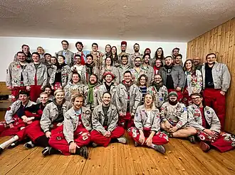 ![]() Allmand Chaoten Orchester in den typischen roten Latzhosen und grauen Jacken (2022) | |
