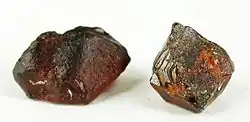 Rhodolithe, allgemein auch als orientalische Granate bekannt, sind rosa- bis rotviolette Almandin-Varietäten, die genau genommen Almandin-Pyrop-Mischkristalle mit einem Mischungsverhältnis von Magnesium : Eisen ≈ 2 : 1 und einer Dichte von etwa 3,84 g/cm³[31] sind. Bekannte Vorkommen für Rhodolith sind unter anderem Brasilien, Indien, Kenia, Madagaskar, Mexiko, Sambia und Tansania.[32]