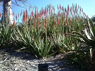 Der Blütenstand besteht aus zahlreichen Zweigen und erreicht eine Länge von 100 bis 150 Zentimeter. Die unteren Zweige sind nochmals verzweigt. Die kopfigen Trauben sind 3 bis 6 Zentimeter lang, 7 Zentimeter breit und bestehen aus etwa 15 Blüten. Die deltoid spitz zulaufenden Brakteen weisen eine Länge von 8 Millimeter auf. Die an der Basis trüb scharlachroten Blüten sind an ihrer Mündung heller. Sie stehen an 20 Millimeter lange Blütenstielen. Die Blütenstiele an den seitlichen Trauben sind kürzer. Die Blüten sind 27 Millimeter lang und an ihrer Basis gerundet. Auf Höhe des Fruchtknotens weisen die Blüten einen Durchmesser von 5,5 Millimeter auf. Darüber sind sie auf 3,5 Millimeter verengt und schließlich zur Mündung auf 6 Millimeter erweitert. Ihre äußeren Perigonblätter sind auf einer Länge von 7 Millimetern nicht miteinander verwachsen. Die Staubblätter und der Griffel ragen kaum aus der Blüte heraus.