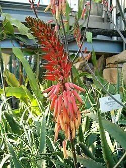 Der Blütenstand ist einfach oder besteht aus drei bis vier Zweigen und ist 50 bis 70 Zentimeter lang. Die dichten, zylindrisch-konischen Trauben sind 18 Zentimeter lang und 8 bis 9 Zentimeter. Die eiförmig-spitzen Brakteen weisen eine Länge von 5 Millimeter auf und sind 4 Millimeter breit. Die orangeroten Blüten sind an ihrer Mündung gelblich. Sie stehen an 20 bis 25 Millimeter langen Blütenstielen. Die Blüten sind 40 Millimeter lang und an ihrer Basis kurz verschmälert. Auf Höhe des Fruchtknotens weisen sie einen Durchmesser von 7 bis 8 Millimeter auf. Darüber sind sie leicht verengt und schließlich zu ihrer Mündung hin erweitert. Ihre Perigonblätter sind auf einer Länge von 15 Millimetern nicht miteinander verwachsen. Die Staubblätter und der Griffel ragen 3 bis 5 Millimeter aus der Blüte heraus.