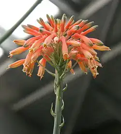Der Blütenstand besteht aus vier bis sieben Zweigen und ist etwa 90 Zentimeter lang. Die lockeren, zylindrischen und leicht spitz zulaufenden Trauben sind bis zu 20 Zentimeter lang und bestehen aus 20 bis 30 Blüten. Gelegentlich sind die Blütentrauben kürzer und dichter. Die deltoid spitz zulaufenden, weißen Brakteen weisen eine Länge von 10 bis 15 Millimeter auf. Die Zipfel der trüb rötlichen, selten weißen Blüten besitzen einen 1,5 Millimeter breiten weißen Rand. Die keulenförmigen Blüten stehen an 10 bis 15 Millimeter langen Blütenstielen. Sie sind 28 bis 30 Millimeter lang und an ihrer Basis gerundet. Oberhalb des Fruchtknotens sind die Blüten leicht verengt und anschließend zu ihrer Mündung hin erweitert. Ihre äußeren Perigonblätter sind auf einer Länge von etwa 8 bis 10 Millimetern nicht miteinander verwachsen. Die Staubblätter und der Griffel ragen bis zu 5 Millimeter aus der Blüte heraus.