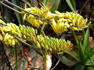 Der Blütenstand ist einfach oder besteht aus ein bis drei Zweigen. Er erreicht eine Länge von bis zu 100 Zentimeter. Die lockeren, zylindrischen Trauben sind 15 bis 20 Zentimeter lang. Die eiförmig-spitzen oder lanzettlichen Brakteen weisen eine Länge von 10 Millimeter auf. Die leicht keulenförmigen, roten oder gelben bis orangefarbenen Blüten stehen an 6 bis 8 Millimeter langen Blütenstielen. Die Blüten sind 28 bis 30 Millimeter lang. Ihre äußeren Perigonblätter sind auf einer Länge von etwa 15 Millimeter nicht miteinander verwachsen. Die Staubblätter und der Griffel ragen kaum aus der Blüte heraus.