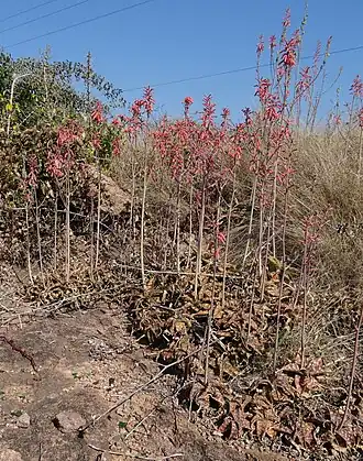 Der Blütenstand besteht aus vier bis acht Zweigen und erreicht eine Länge von 100 bis 200 Zentimeter. Die unteren Zweige sind gelegentlich nochmals verzweigt. Die lockeren, zylindrischen, leicht spitz zulaufenden Trauben sind 15 bis 20 Zentimeter (selten bis 40 Zentimeter) lang, 6 bis 7 Zentimeter breit und bestehen aus 40 bis 50 Blüten. Die deltoid oder lanzettlich spitz zulaufenden Brakteen sind so lang wie die Blütenstiele. Die korallenroten oder trüb bis glänzend roten, gelegentlich leicht bereiften Blüten stehen an 6 bis 15 Millimeter langen Blütenstielen. Die Blüten sind 30 bis 35 Millimeter (selten bis 40 Millimeter) lang und an ihrer Basis gestutzt. Auf Höhe des Fruchtknotens weisen die Blüten einen Durchmesser von 7 bis 9 Millimeter auf. Darüber sind sie abrupt auf 5 bis 6 Millimeter verengt und schließlich zur Mündung erweitert. Ihre Perigonblätter sind auf einer Länge von 8 bis 10 Millimeter nicht miteinander verwachsen. Die Staubblätter und der Griffel ragen 1 bis 2 Millimeter aus der Blüte heraus.