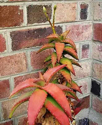 Der Blütenstand besteht aus zwei bis drei Zweigen und erreicht eine Länge von etwa 40 Zentimeter. Die lockeren, zylindrischen Trauben sind 9 bis 15 Zentimeter lang und 6 bis 7 Zentimeter breit. Die lanzettlich spitz zulaufenden Brakteen weisen eine Länge von 6 bis 8 Millimeter auf und sind 3 Millimeter breit. Die gelben oder ziegelroten Blüten stehen an etwa 20 Millimeter langen Blütenstielen. Die Blüten sind 23 Millimeter lang und an ihrer Basis verschmälert. Oberhalb des Fruchtknotens sind die Blüten zur Mündung erweitert. Ihre Perigonblätter sind auf einer Länge von 12 bis 13 Millimeter nicht miteinander verwachsen.