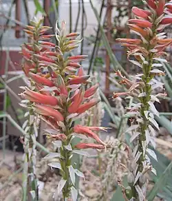 Der Blütenstand ist einfach oder besteht aus bis zu fünf Zweigen. Er erreicht eine Länge von 1 bis 2 Meter. Die ziemlich dichten, zylindrisch Trauben sind 35 bis 40 Zentimeter lang. Die eiförmig spitz zulaufenden Brakteen weisen eine Länge von 10 bis 15 Millimeter auf und sind 6 Millimeter breit. Die roten oder gelben Blüten stehen an 5 bis 10 Millimeter langen Blütenstielen. Die Blüten sind etwa 30 Millimeter lang und an ihrer Basis gerundet. Auf Höhe des Fruchtknotens weisen die Blüten einen Durchmesser von 8 Millimeter auf. Darüber sind sie leicht verengt und dann zur Mündung leicht erweitert. Ihre äußeren Perigonblätter sind auf einer Länge von 10 bis 16 Millimetern nicht miteinander verwachsen. Die Staubblätter und der Griffel ragen 2 bis 3 Millimeter aus der Blüte heraus.