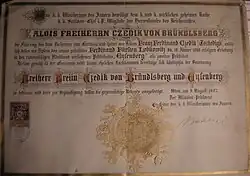 Czediks Adelsprädikat von Bründlsberg wurde schon zu seinen Lebzeiten oft irrtümlicherweise Bründelsberg geschrieben. Die richtige Schreibweise wurde in der Urkunde bestätigt, die am 9. August 1897 anlässlich der Verleihung des zweiten Prädikats und Eysenberg ausgestellt und von k.k. Ministerpräsident Kasimir Felix Badeni persönlich unterzeichnet wurde.