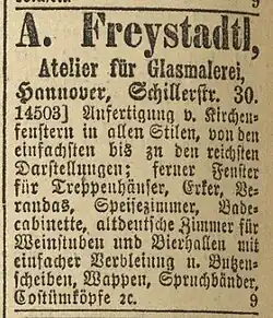 Nachdem der Kunst- und Glasmaler Heinrich Horn schon 1855 in der Residenzstadt des Königreichs Hannover eine erste Werkstatt für Glasmalereien eröffnet hatte, gründete der gebürtige Ungar Alois Freystadtl, der eine Hannoveranerin geheiratet hatte, um 1881 ebenda die „Erste hannoversche Glasmalerei – Bleiverglasungen mit und ohne Malerei“.[1]