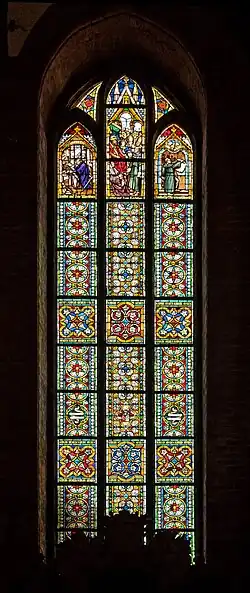 - 1892 (Auftragsdatum), St. Petri-Dom in Schleswig, im Auftrag und teilweiser Mitwirkung von August Olbers, im Westjoch des Doms: