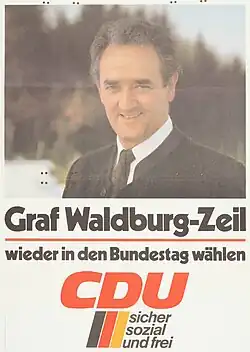 Von 1980 bis 1998 war Alois Graf von Waldburg-Zeil Mitglied des Deutschen Bundestags für den Bundestagswahlkreis Biberach. Er wurde 1983 mit 75,1 Prozent in seinem Biberacher Wahlkreis gewählt.[3]