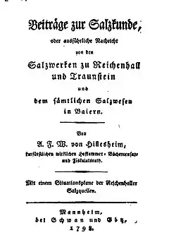- Beiträge zur Salzkunde: Oder ausführliche Nachricht von den Salzwerken zu Reichenhall und Traunstein. Mannheim 1798. 77 Seiten. Online-Ausgabe