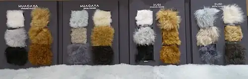 Es gibt zwei Alpakatypen, das Huacaya und das Suri. Sie unterscheiden sich in der Struktur ihrer Faser (Wolle): Das Huacaya-Alpaka hat eine feine, gleichmäßig gekräuselte Faser und einige Grannenhaare (Deckhaare). Das Suri-Alpaka hingegen hat keine Kräuselung in der Faser, das Haar bildet gelockte, gerade Strähnen, die am Tier herabhängen. An den Rumpfseiten der Alpakas ist das Haar besonders lang.[1]