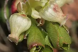 Die zwittrigen Blüten sind radiärsymmetrisch und fünfzählig mit doppelter Blütenhülle. Der Kelch ist fünfzipflig und hat nur ein Viertel der der Länge der Krone. Die Kelchzipfel sind dreieckig und schwach bewimpert.[1] Die rosafarbene bis grünlich-weiße Blütenkrone ist bei einer Länge von etwa 5 Millimetern kugelig-krugförmig, mit kleiner Öffnung und endet in fünf nach auswärts gebogenen Kronzipfeln. Die Blüte enthält zehn Staubblätter und ein verwachsenblättriges Gynoeceum.[2] Der Fruchtknoten ist kugelig und fünffächrig und am Grund von einem zehnwulstigen Nektarring umgeben.[1] Der Griffel ist etwas länger als die Staubblätter.[1]