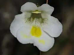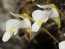 Die zwittrigen Blüten sind bei einer Länge von 10 bis 16 Millimetern zygomorph und fünfzählig mit doppelter Blütenhülle. Die fünf Kelchblätter sind verwachsen. Es ist ein mit einer Länge von 2 bis 3 Millimetern relativ kurzer, kegelförmiger, gelb-grüner Sporn vorhanden.[1] Die fünf Keronblätter sind verwachsen. Die Blütenkrone besteht aus einer dreilappigen Unterlippe und zweilappigen Oberlippe. Die Blütenkrone ist weiß mit einem in Form und Größe variablen, gelben Schlundfleck. Der Kronschlund ist behaart. Die Blüten sind protogyn, das heißt die weiblichen Narben reifen vor den männlichen Staubbeuteln. Die Bestäubung erfolgt durch Fliegen.