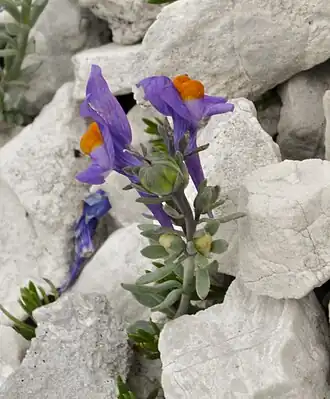 - Aufrechtes Alpen-Leinkraut (Linaria alpina subsp. petraea (Jord.) Rouy): Diese bogig aufsteigende Pflanze ist 10 bis 20 Zentimeter hoch. Ihre Kronzipfel sind halblanzettlich, die Zipfel der Kronoberlippe zwei- bis dreimal so lang wie breit und der Sporn zylindrisch. Sie kommt nur in Frankreich, in der Schweiz und in Österreich vor.[19] Die ökologischen Zeigerwerte nach Landolt et al. 2010 sind in der Schweiz: Feuchtezahl F = 2+ (frisch), Lichtzahl L = 5 (sehr hell), Reaktionszahl R = 5 (basisch), Temperaturzahl T = 2+ (unter-subalpin und ober-montan), Nährstoffzahl N = 2 (nährstoffarm), Kontinentalitätszahl K = 4 (subkontinental).[20]