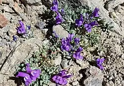 - Gewöhnliches Alpen-Leinkraut (Linaria alpina (L.) Mill. subsp. alpina): Diese niederliegende Pflanze ist 3 bis 10 Zentimeter hoch. Ihre Kronzipfel sind verkehrt-eilanzettlich, die Kronoberlippe ist ein- bis zweimal solange wie breit und der Sporn unterseits abgeflacht. Die ökologischen Zeigerwerte nach Landolt et al. 2010 sind in der Schweiz: Feuchtezahl F = 3+ (feucht), Lichtzahl L = 5 (sehr hell), Reaktionszahl R = 4 (neutral bis basisch), Temperaturzahl T = 1+ (unter-alpin, supra-subalpin und ober-subalpin), Nährstoffzahl N = 2 (nährstoffarm), Kontinentalitätszahl K = 4 (subkontinental).[20]