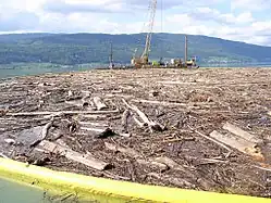 Der Bielersee hat am 22. August die Schadensgrenze überschritten und diverse Ortschaften entlang dem See überflutet. Außerdem wurden riesige Mengen an Schwemmholz (siehe Bild) in den See gespült. Allein aus dem Bielersee mussten insgesamt 7'000–8'000 m3 Holz entfernt werden.