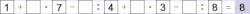 Beispiel für Kinder: 5 Zahlen zwischen 1 und 9 werden über die Grundrechenarten verknüpft, wobei das Ergebnis und je nach Schwierigkeitsstufe unterschiedlich viele Zahlen in wechselnden Mustern vorgegeben werden. Von den einzufügenden Zahlen (eingerahmte Felder) dürfen keine doppelt vorkommen. Das Ergebnis sowie die einzelnen Zwischensummen sind stets ganzzahlig und positiv. Das Beispiel ist für Schüler ab der 2. Klasse geeignet. Siehe auch Miss Lupun.
