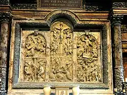 Das polychrome Triptychon aus Kalkstein wurde von einem unbekannten Meister geschaffen. Das Werk zeigt fünf Szenen der Passion Christi: links die Geißelung und Kreuztragung, in der Mitte die Kreuzigung, rechts die Höllenfahrt und die Auferstehung.