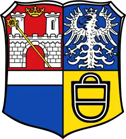 Blasonierung: „In geviertem Schild oben rechts in Rot eine zweitürmige gemauerte silberne Burg mit offenem Tor, belegt mit einem schrägrechts liegenden goldenen Abtstab, darüber schwebend eine dreizackige goldene Krone, oben links in Blau ein silberner Adler, unten rechts ein silbernes Schildhaupt über blauem Feld, unten links in Gold ein schwarzes Gemarkungszeichen in Form des Umrisses eines geteilten Halbrundschildes mit henkelförmigem Absatz am oberen Schildrand.“[10] |