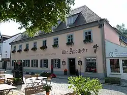 - ↑ Volker Helas (Bearb.): Stadt Radebeul. Hrsg.: Landesamt für Denkmalpflege Sachsen, Große Kreisstadt Radebeul (= Denkmaltopographie Bundesrepublik Deutschland. Denkmale in Sachsen). Sax-Verlag, Beucha 2007, ISBN 978-3-86729-004-3, S. 36 (Auf dem Foto in der Denkmaltopografie ist noch das große Apotheken-A zu sehen).