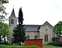 Die Kreuzkirche wurde 1875 anstelle einer Fachwerkkirche nach einem Entwurf von Ferdinand Ludwig August Merckel aus Bruchsteinen erbaut. Sie besteht aus einem Langhaus, das mit Lisenen in drei Achsen gegliedert ist, einem Querschiff, das höher als das Langhaus ist, einem rechteckigen Chor im Norden und einem mit einem schiefergedeckten spitzen Helm bedeckten Kirchturm im Süden, dessen oberstes Geschoss die Turmuhr und den Glockenstuhl beherbergt.